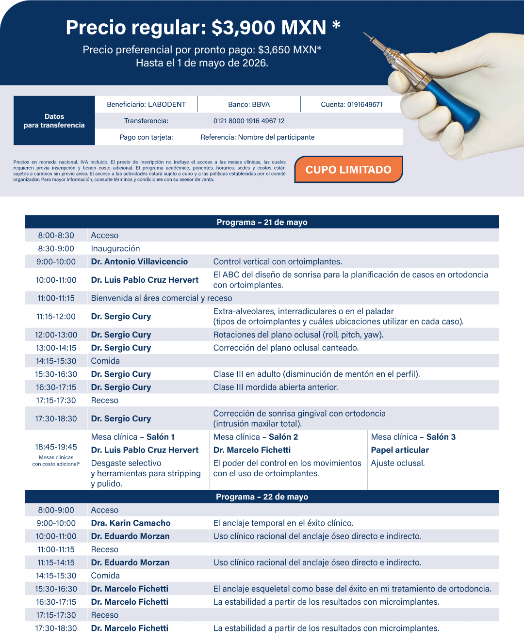 | Congreso + 1 mesa clinica PRECIO LANZAMIENTO hasta el 1o Mayo 2026 | $ 4,650 MXN |