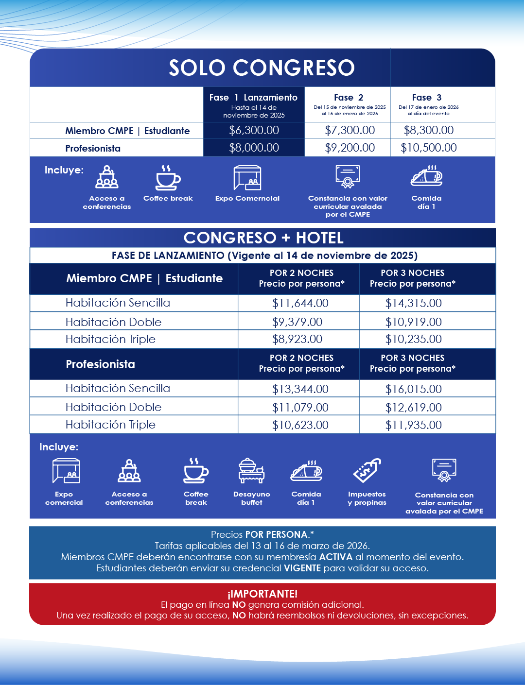 Miembro CMPE | CONGRESO + Habitación triple | 2 noches | Precio por persona (Vigente al 14 de noviembre) | $ 8,923 MXN |