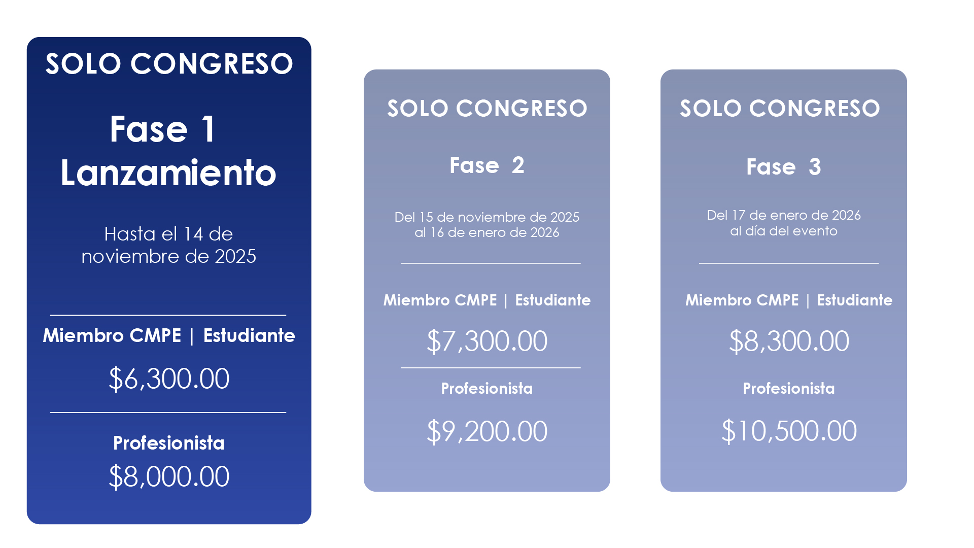 1. Miembro CMPE | Precio lanzamiento | SOLO CONGRESO (Vigente al 14 de noviembre) | $ 6,300 MXN |