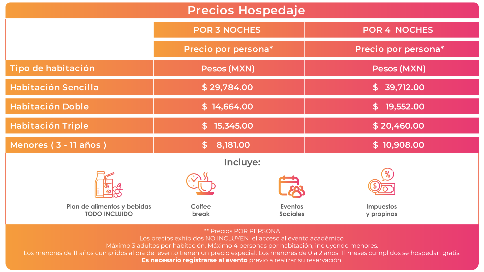 - Los precios exhibidos son POR PERSONA. El asistente deberá realizar su registro y pago de forma individual y en caso de seleccionar el tipo de ocupación doble o triple deberá mencionar los nombres con quienes comparte habitación al momento de registrarse y su fecha de entrada y salida, de lo contrario NO se confirmará la reservación.